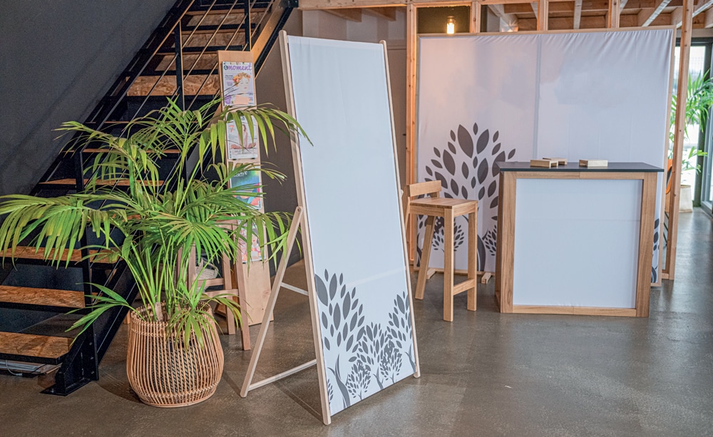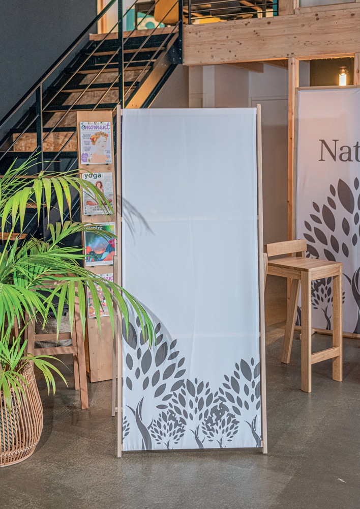 Le Kakemono Bois est la solution de signalétique suspendue idéale pour les entreprises souhaitant allier visibilité et engagement écologique. Conçu avec des bagues de suspension en bois naturel, il offre une alternative esthétique et durable aux rails en aluminium classiques. Son rendu authentique s’intègre parfaitement dans les boutiques bio, les showrooms épurés ou lors d’événements axés sur le développement durable.